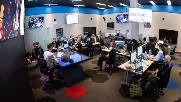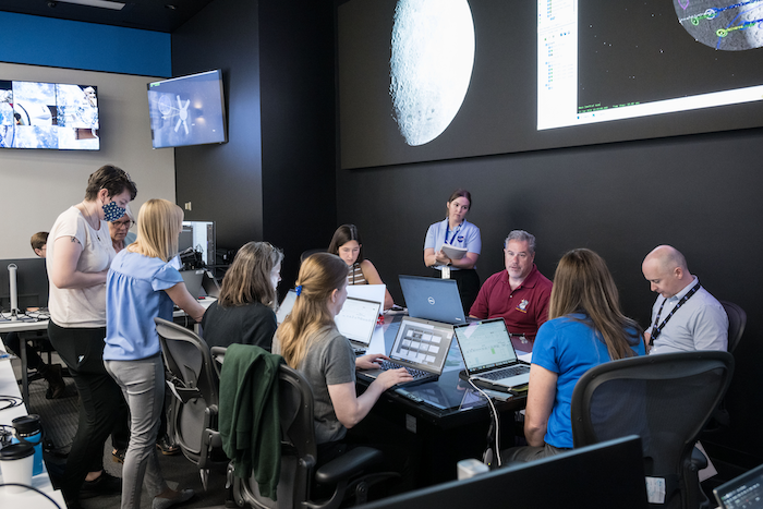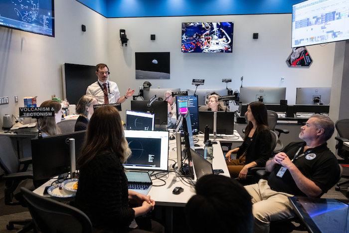 So, our Science Officers are supported by the Lunar Science Team staffed in two additional rooms. We have the Science Evaluation Room, which is a brand new built-out facility, also in the Mission Control Center at JSC [Johnson Space Center], and that’s where I sit. And then we have a second room across campus at JSC that’s called the Science Mission Operation Room, or “the s’more” as they call it. In total, we have around around 35 team members staffed between these two rooms throughout the whole mission profile. Our team has a wide variety of expertise, from lunar and planetary science, to data visualization, to software development, and more. And our responsibilities change throughout the mission depending on what stage we’re in.