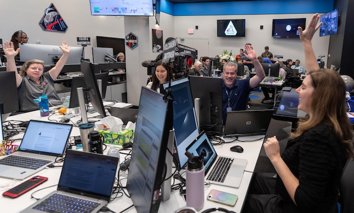 The Artemis II Lunar Science Team reacts to astronauts’ observations of Moon features during their flyby on April 6, 2026. Standing on the left is Artemis II Co-Deputy Lunar Science Lead Marie Henderson. In the right foreground is Ariel Deutsch, with Maria Banks behind her, Ryan Watkins to her right, and Sara Schmidt in the checkered jacket. Image: NASA/Luna Posadas Nava